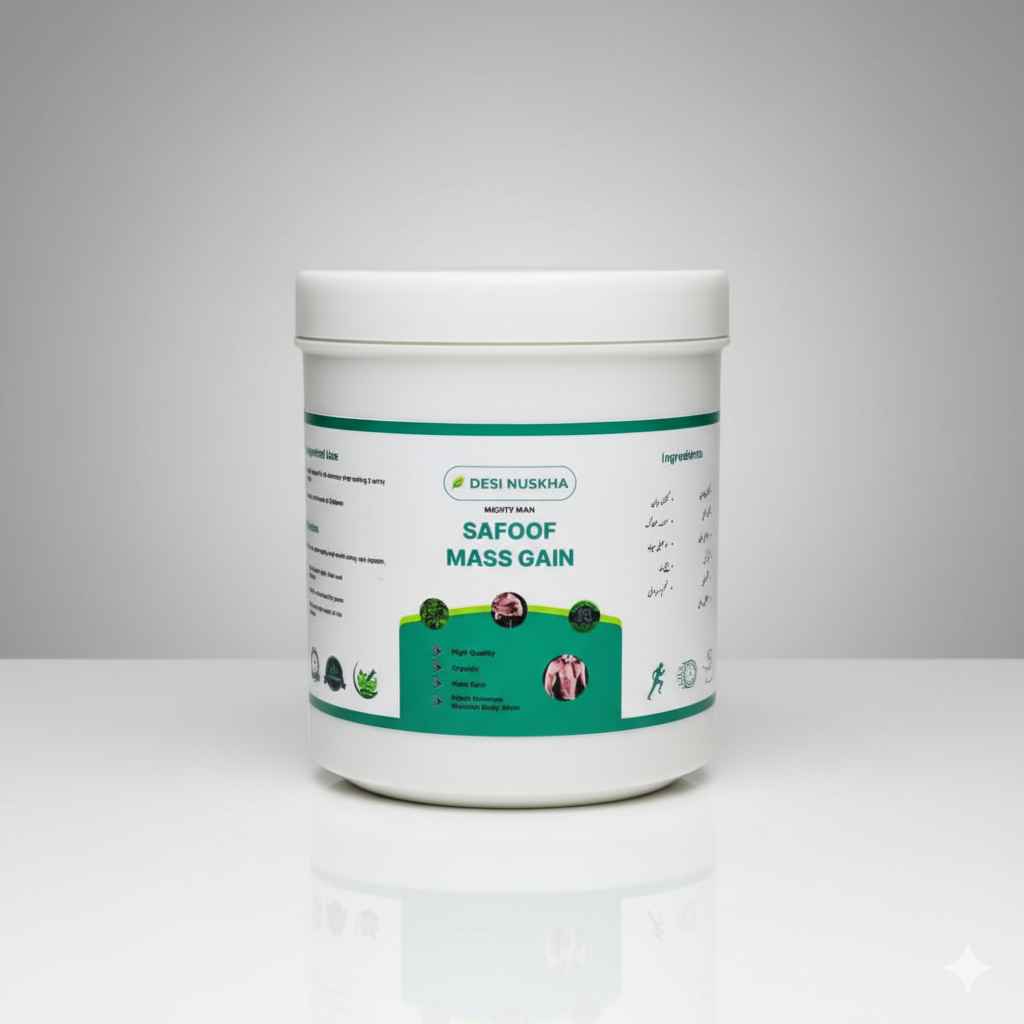 Unlock your body's natural potential with Safoof Mass Gain, a powerful herbal blend crafted to support healthy weight gain and overall vitality. Made from 100% natural ingredients sourced from trusted herbal farms, this unique formula is designed to improve digestion, enhance nutrient absorption, and boost metabolism - helping you achieve a balanced and healthy physique naturally. Each serving of Safoof Mass Gain is enriched with a synergistic mix of Kalwanji, Ajwain, Mint, Saunf, Ginger, Green Tea Extracts, and Carom Seeds, carefully selected for their time-tested benefits in traditional wellness. These potent herbs work together to strengthen appetite, improve gut health, and provide sustained energy throughout the day. •Kalwanji (Black Seeds):Supports metabolism and immunity. 。Ajwain & Carom Seeds: Promote healthy digestion and appetite. • Mint & Saunf (Fennel): Soothe the stomach and aid nutrient absorption. • Ginger: Enhances metabolism and energy levels. Green Tea Extracts: Rich in antioxidants to support overall wellness. Free from chemicals, preservatives, and arti..c additives, Safoof Mass Gain is safe for daily use and suitable for both men and women. Whether you're looking to build muscle, regain healthy weight, or simply feel more energized, this herbal formula is your natural partner on the journey to better health and vitality. Experience the power of nature. Gain strength, energy, and confidence -the herbal way with Safoof Mass Gain.